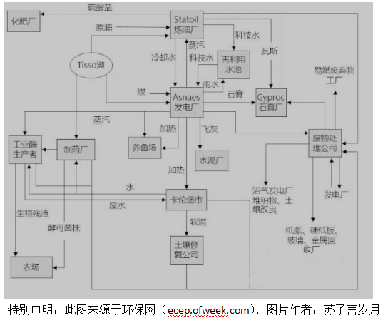 “一门六院士,半门皆教师。”钱易先生出生于江苏苏州的一家书香门第,父亲钱穆是国学大师,堂兄钱伟长是著名科学家。从青丝到白发,她是几代清华人的记忆,如今已经八十二岁高龄,却仍然躬耕于三尺讲台。她长期致力于研究开发我国高效、低耗废水处理新技术,积极倡导非传统水资源的开发利用,推行清洁生产、循环经济和可持续发展的研究与实践,在参与国家环境立法、提出政策建议和建立示范省市方面作出了重要贡献。在讲座中,钱易先生提到循环经济理念“从摇篮到坟墓”到“从摇篮到摇篮”的转变,并列举世界发达国家循环经济发展的先进案例。例如丹麦的卡伦堡生态工业园是世界上最早和目前国际上运行最为成功的生态工业园,作为一种生产发展、资源利用和环境保护形成良性循环的工业园建设模式,它的基本特征是按照工业生态学的原理,通过企业间的物质、能量和信息集成,形成产业间的代谢和共生耦合关系,使一家企业的废水、废气、废渣、废热成为另一家企业的原料和能源,所有企业通过彼此利用“废物”而获益。借助循环经济,实现了废弃物的循环利用,一个企业的废弃物或副产品成为其他企业的原材料或替代部分原材料;减少了包括水、煤炭、石油、石膏等自然资源的消耗;减少了二氧化碳和二氧化硫的排放,有效缓解了工业发展对大气、水和土地资源的污染;在能源生产过程中提高了综合利用效率。卡伦堡生态工业园模式大体如下图所示:
