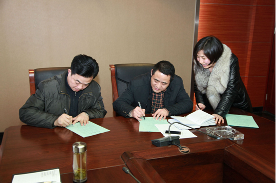 图为:纪检组长(右二)与审计组长签订审计组廉政承诺书。