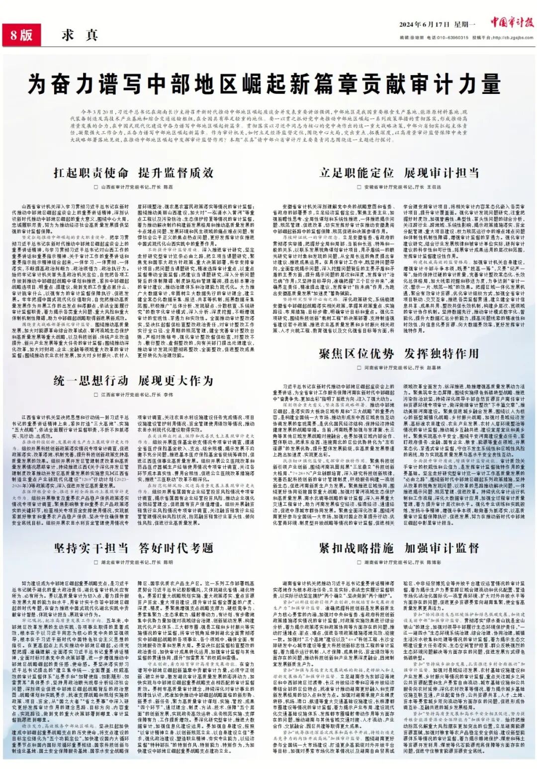 今年3月20日,习近平总书记在湖南长沙主持召开新时代推动中部地区崛起座谈会并发表重要讲话强调,中部地区是我国重要粮食生产基地、能源原材料基地、现代装备制造及高技术产业基地和综合交通运输枢纽,在全国具有举足轻重的地位。要一以贯之抓好党中央推动中部地区崛起一系列政策举措的贯彻落实,形成推动高质量发展的合力,在中国式现代化建设中奋力谱写中部地区崛起新篇章。贯彻落实以习近平同志为核心的党中央作出的这一重大战略决策,中部六省切实扛起主体责任,凝聚强大工作合力,正奋力谱写中部地区崛起新篇章。作为审计机关,如何立足经济监督定位,围绕中心大局,突出重点、拓展深度,以高质量审计监督保障中央重大战略部署落地见效,在推动中部地区崛起中发挥审计监督作用?中部六省审计厅主要负责同志围绕这一主题进行了探讨。敬请关注。