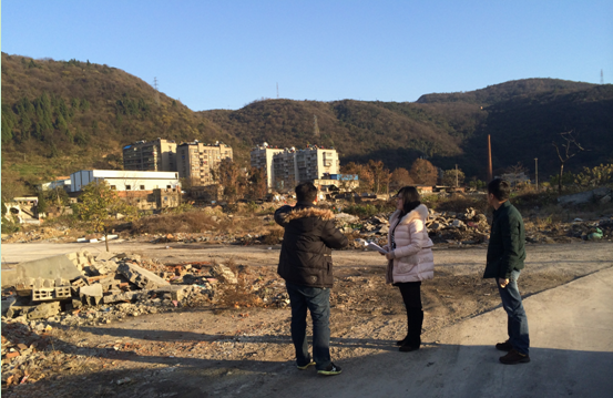 图为:土地储备中心人员为审计组介绍收储工矿集团土地时地面房屋清拆进度