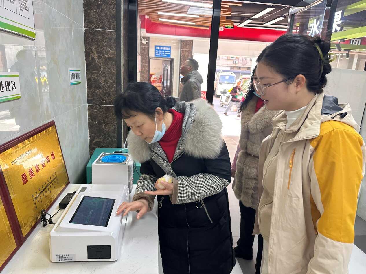 近日,黄石市审计局在开展市场监管局2024年度部门预算执行情况审计中,重点关注农贸市场食品安全快检室建设情况。审计人员通过深入现场查看检验试剂配备、蔬菜水果肉类留样抽检、检测设施设备的管理使用以及农贸市场食品抽检公告等方式,促进市场监管部门强化食品安全检查工作,切实为守护群众市民“菜篮子”“果盘子”安全无忧贡献审计力量。图为审计人员实地查看农贸市场食品安全快检室建设情况。