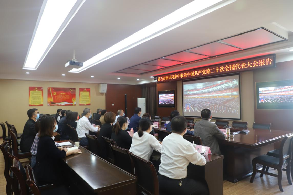 图为:黄石市审计局全体干部职工认真聆听党的二十大报告
