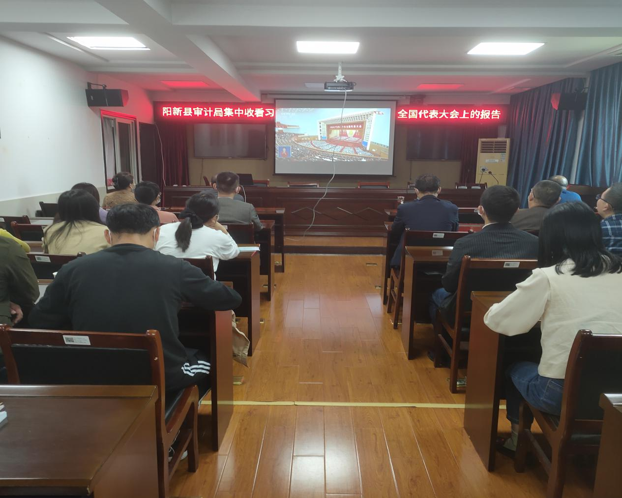 图为:黄石市阳新县审计局全体干部职工认真聆听党的二十大报告