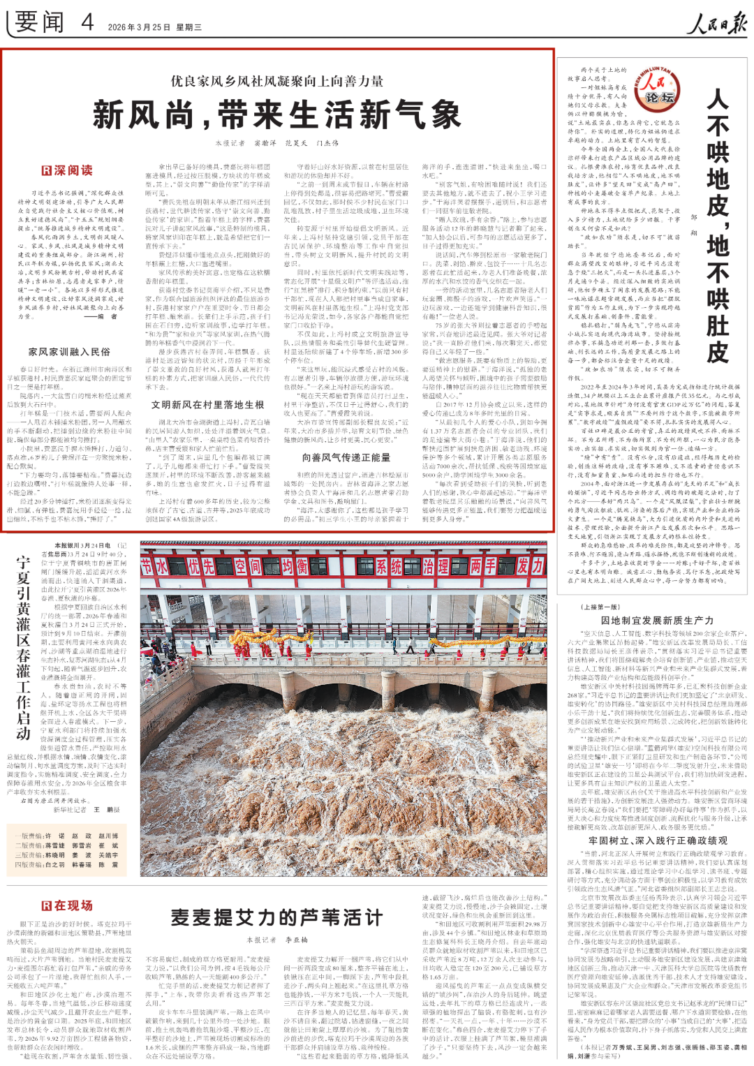 春风化雨润乡土,文明新风暖人心。家风、乡风、社风是城乡精神文明建设的重要组成部分。浙江湖州,村民以年糕为媒,弘扬优良家风;湖北大冶,文明乡风扮靓古村,带动村民共富共享;吉林松原,志愿者走家串户,情暖“一老一小”。各地以多样形式推进精神文明建设,让好家风浸润家庭,好乡风滋养乡村,好社风凝聚向上向善力量。
